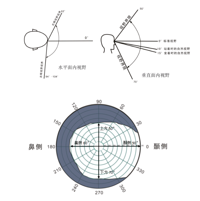 鼻側(cè)視野范圍一般為60°左右(鼻梁的遮擋)